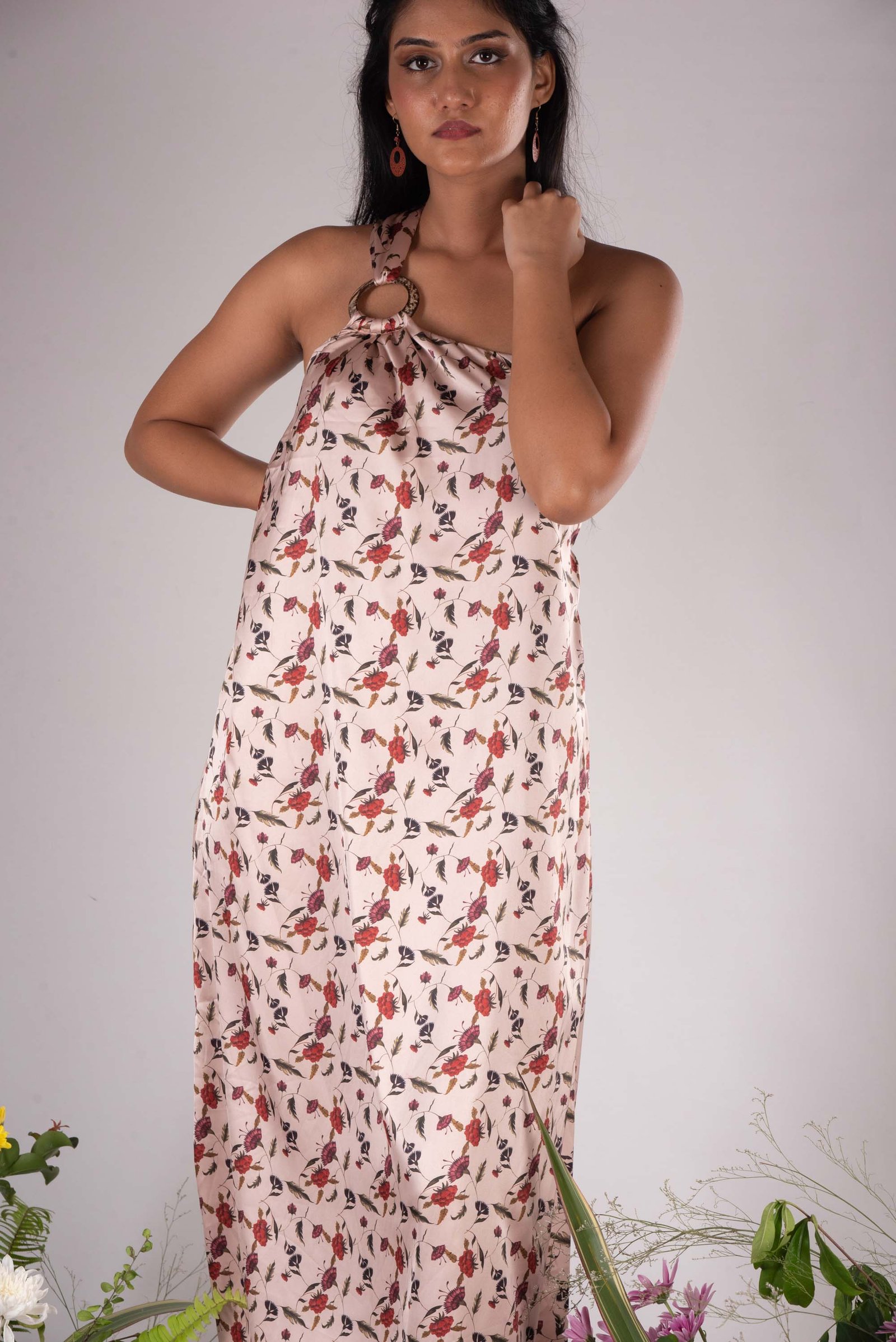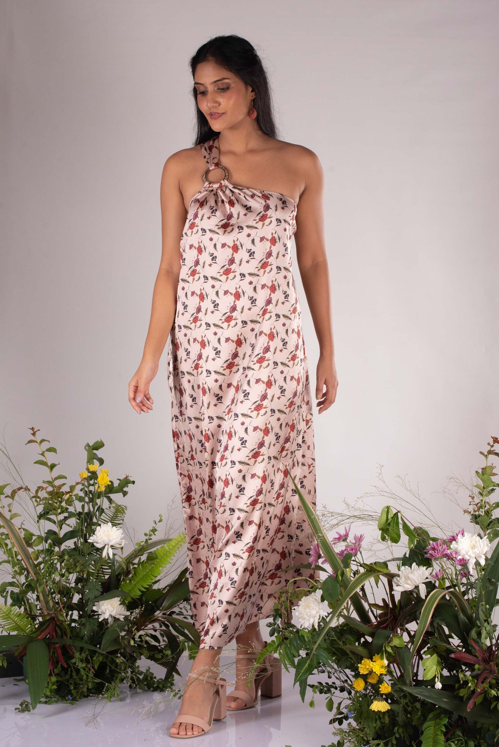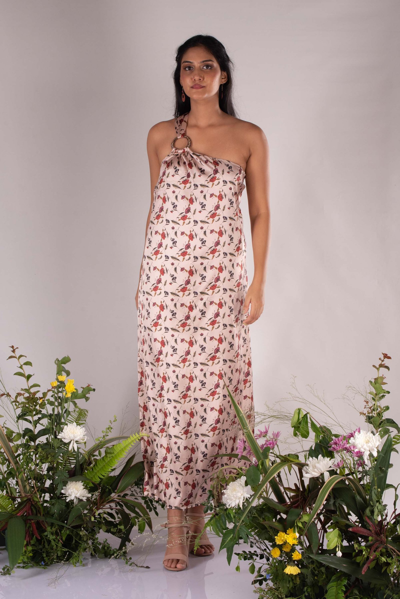 One-size dress made from Satin silk printed with hand painted floral motifs derived and inspired by ancient Sri Lankan tapestry art.