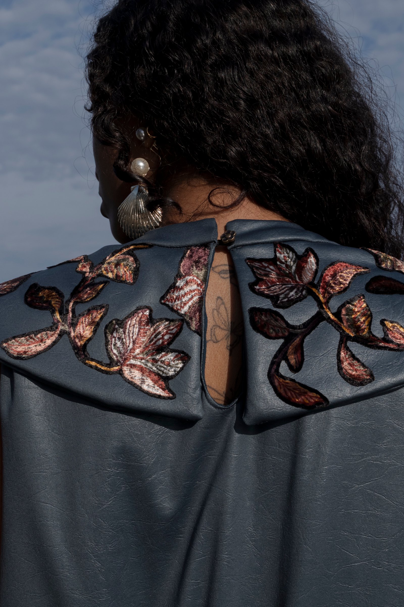 - Exaggerated collar with velvet floral appliqué