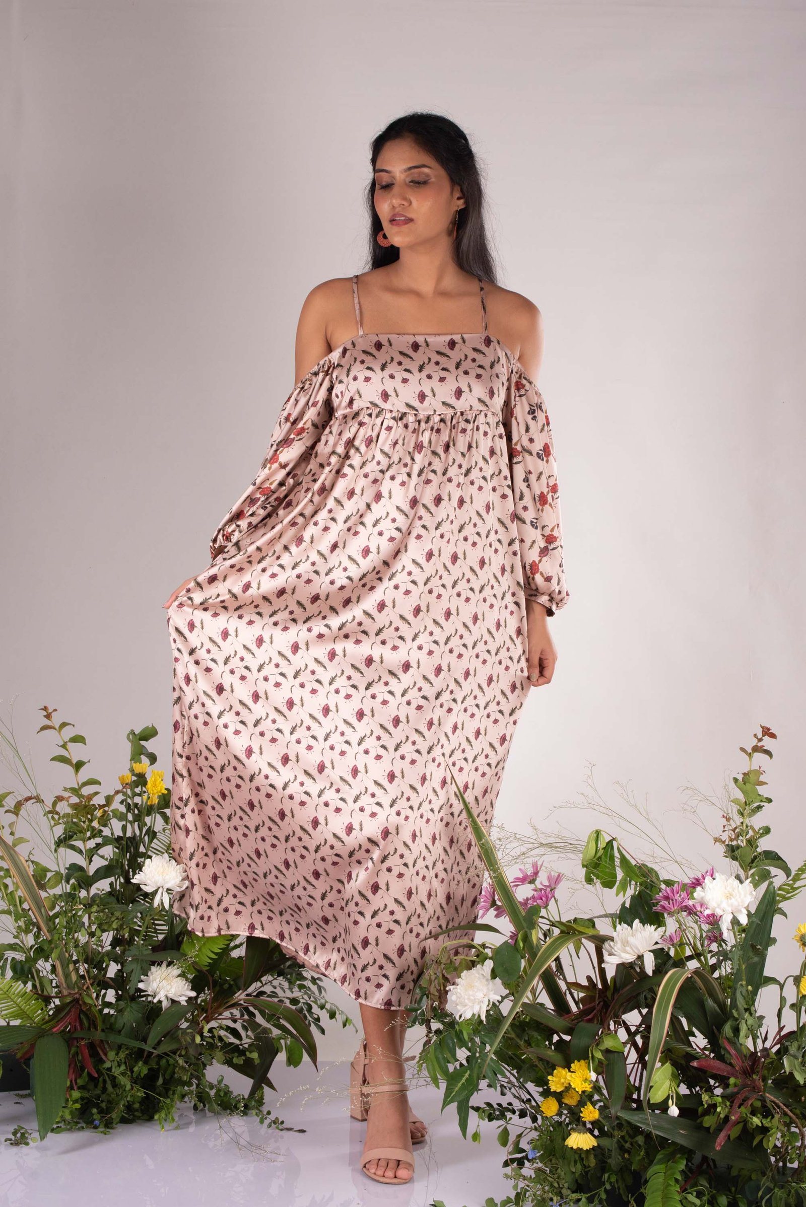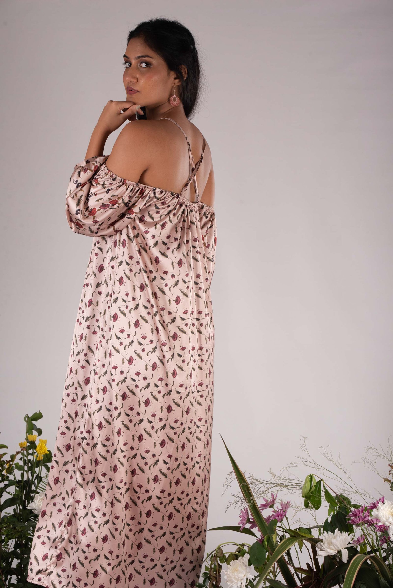 One-size dress made from Satin silk printed with hand painted floral motifs derived and inspired by ancient Sri Lankan tapestry art.